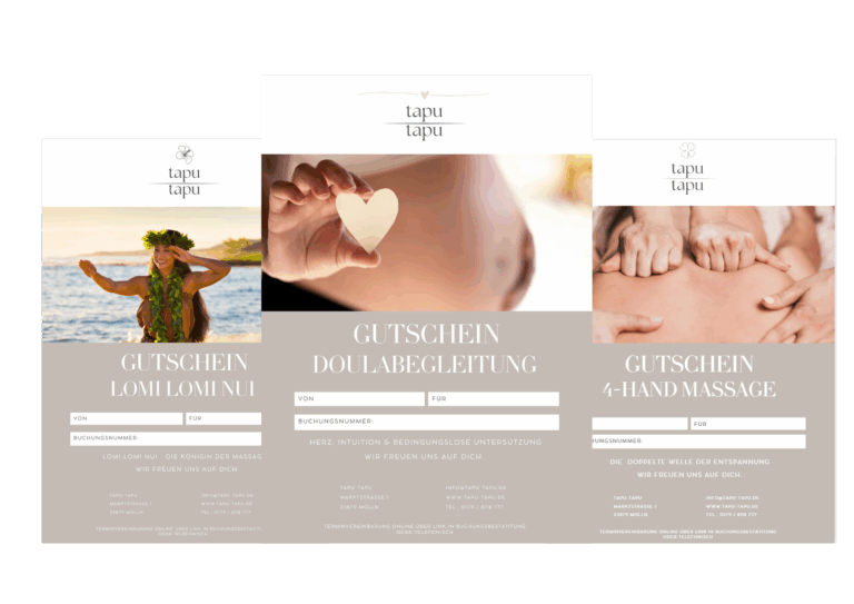 Gültigkeit: Unsere Gutscheine sind 3 Jahre gültig und übertragbar. Einlösbar im tapu-tapu Salon, Seestraße 1, Mölln.